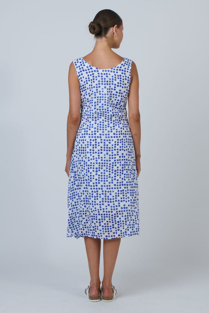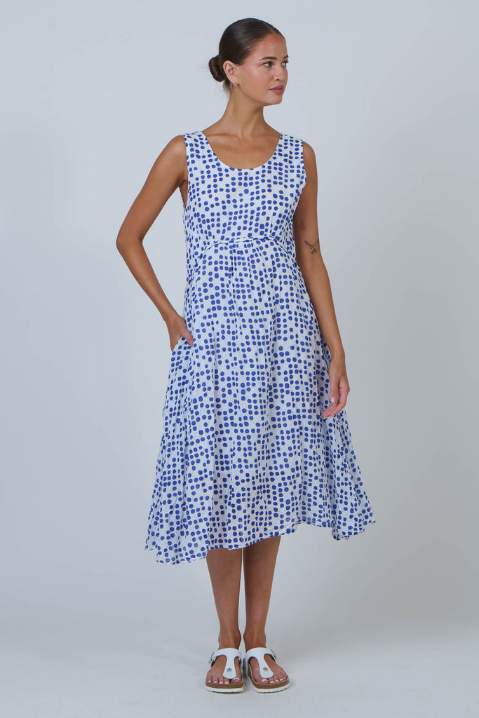 Light, flowing, and flattering, the N74 dress features a sleeveless silhouette, classic scooped neckline, and a defined waist that flows into a breezy A-line skirt. Practical side pockets and a subtle high-low hemline add movement, while the lightweight 100% crinkle cotton fabric ensures comfort. Perfect for both casual and more dressed-up occasions with the right accessories.
