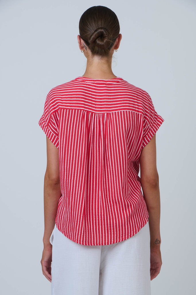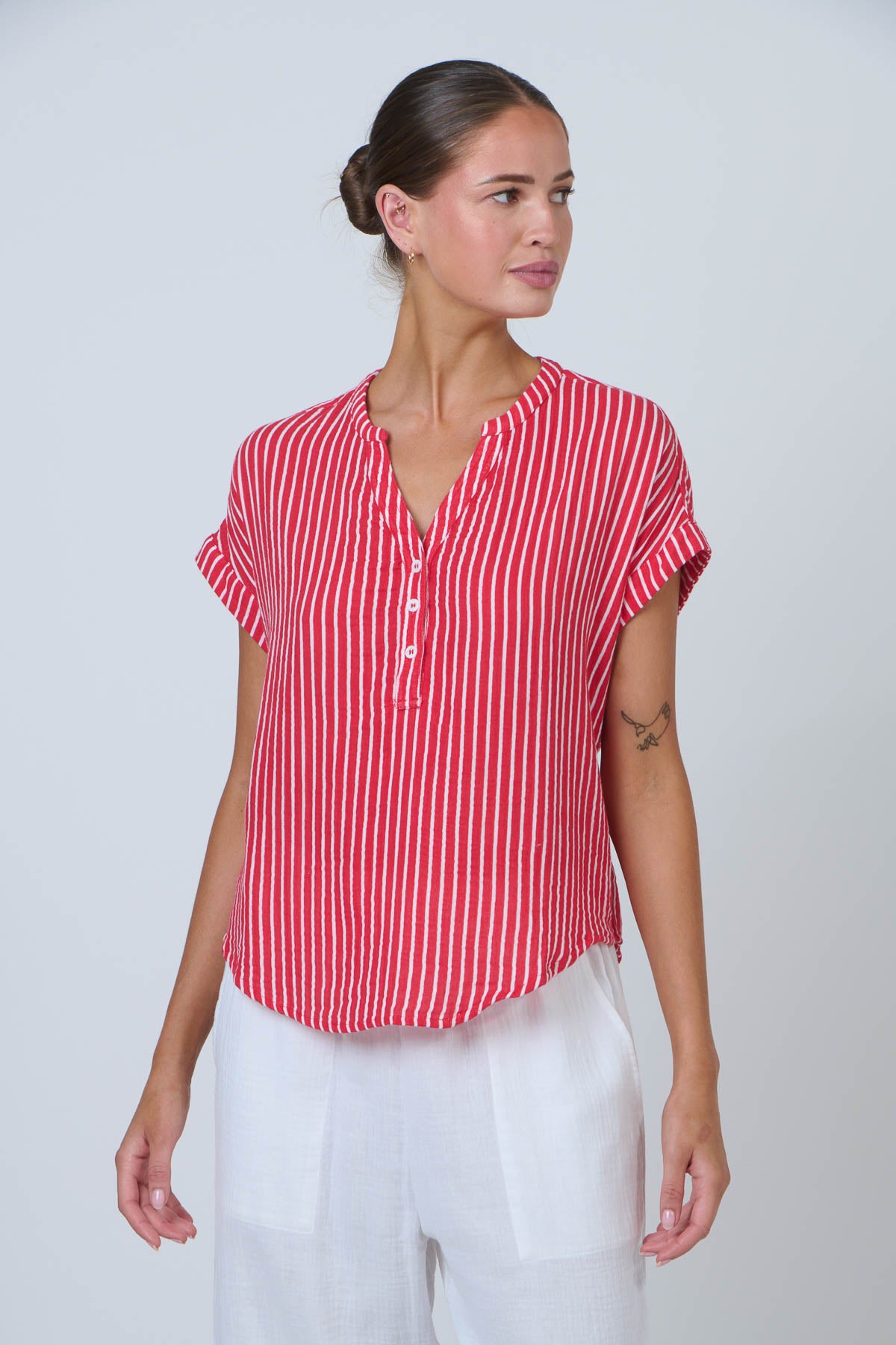 Channel your timeless appeal with the NAM46 striped top, crafted from 100% cotton for breathable comfort. It features a relaxed fit with dolman short sleeves, a partial button placket, collarless V-neckline, and a gently curved hem that flatters and pairs effortlessly with trousers or skirts.