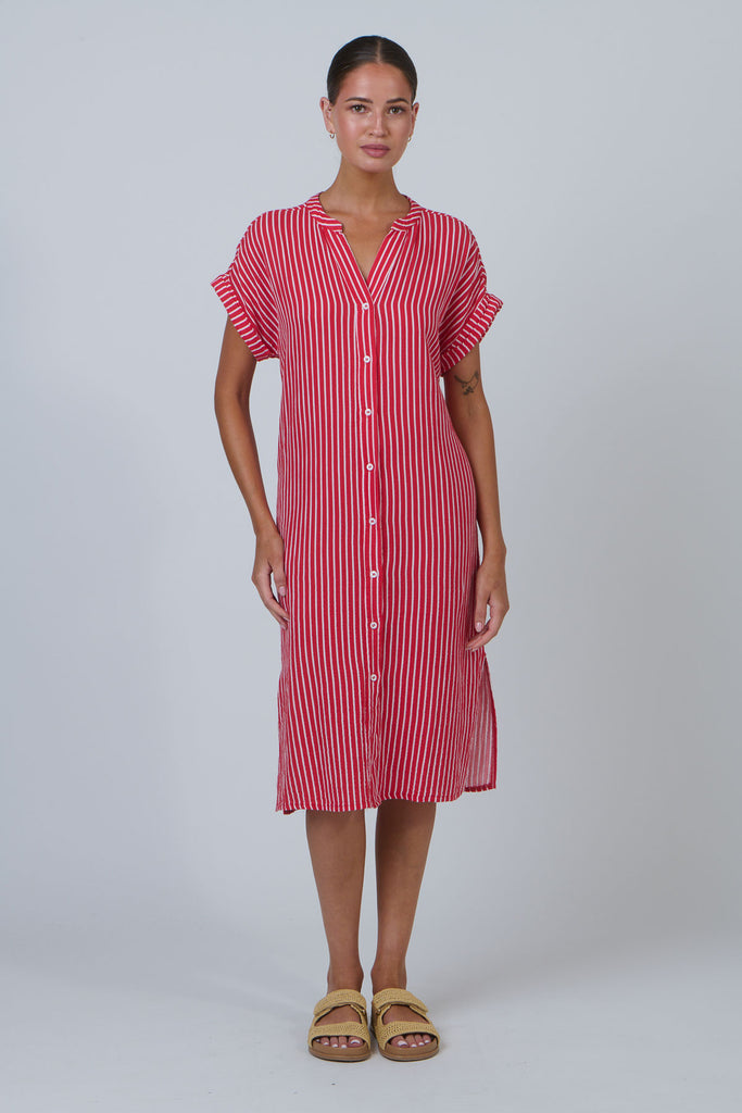 Is it a dress? Is it a top? It's your new fave, either way. Crafted from 100% cotton, the NAM65 striped button-down midi features a relaxed fit with split sides, mandarin collar and cuffed short sleeves for endless styling options. Wear it as a breezy dress on hot days, layered over swimwear as a cover-up, or open over separates as a statement piece.