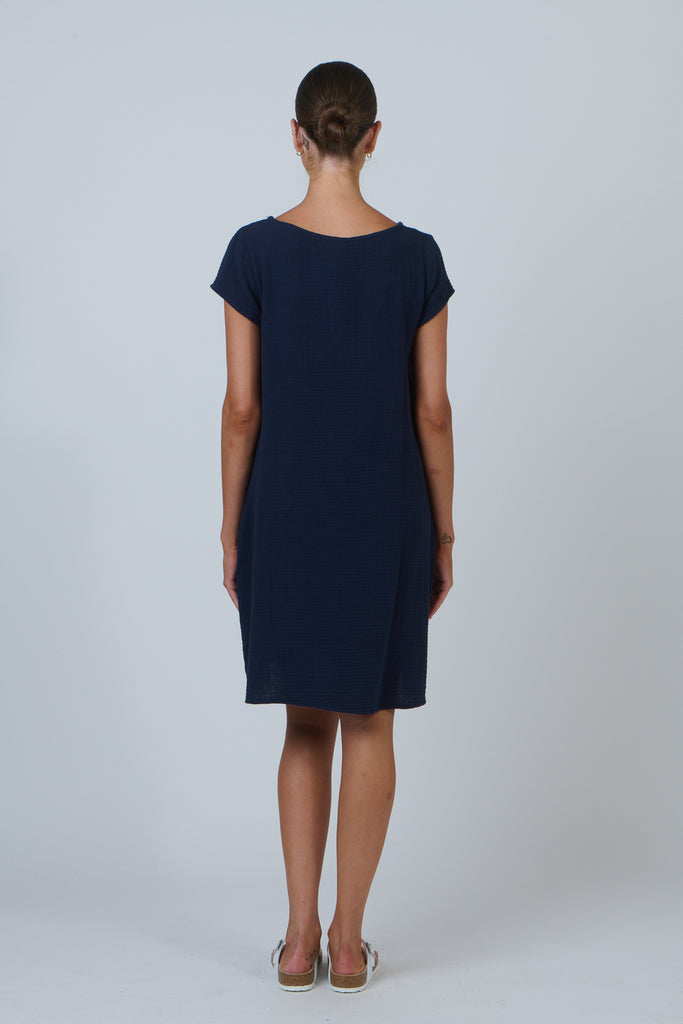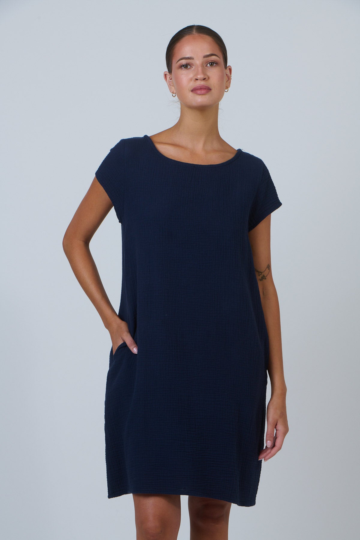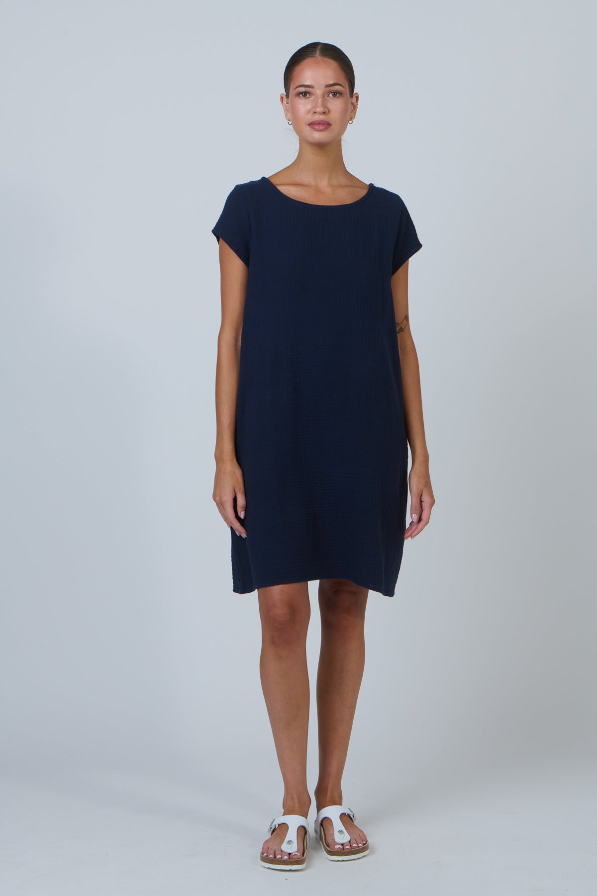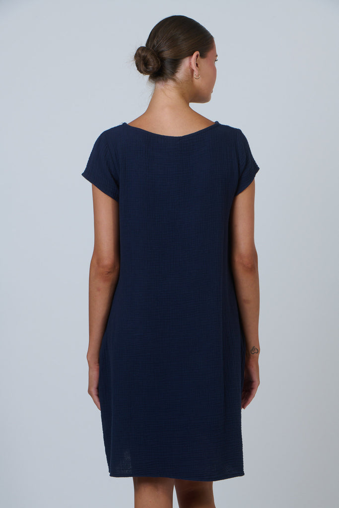 Slip into pure comfort with the NAM73 dress, featuring a simple round neckline, subtle cap sleeves, and a straight silhouette that gently skims the body. Designed with practicality in mind, it includes convenient side pockets—making it the perfect versatile piece that transitions effortlessly from beach cover-up to casual day dress with just a change of accessories. Crafted from 100% cotton.