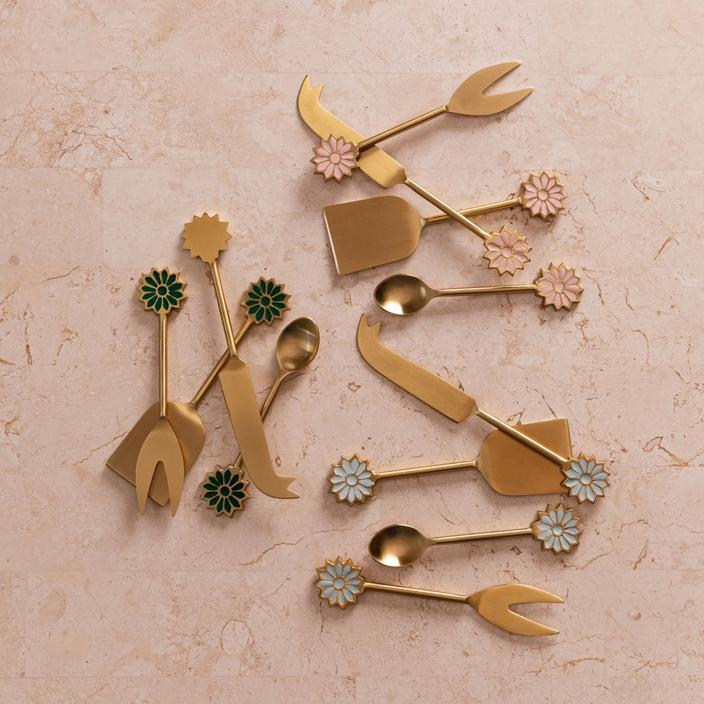 For a glamorous touch, add our Petal Emerald Teaspoon to your tabletop setting. This teaspoon is topped with a unique flower shaped handle and crafted from stainless steel coated with brushed brass and emerald-coloured enamel. Match this design with our Petal Emerald Cheese Knife Set for a unified look at your next event.