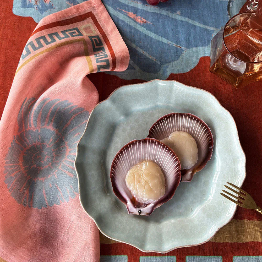 Sea shell print surrounded by a key motif in hues of pastel pink and blue. A colourful and practical garnish for the table. Intended to mix and match, designed to be paired back with summer napkins and staple crockery from the home. Napkin set of 4.
