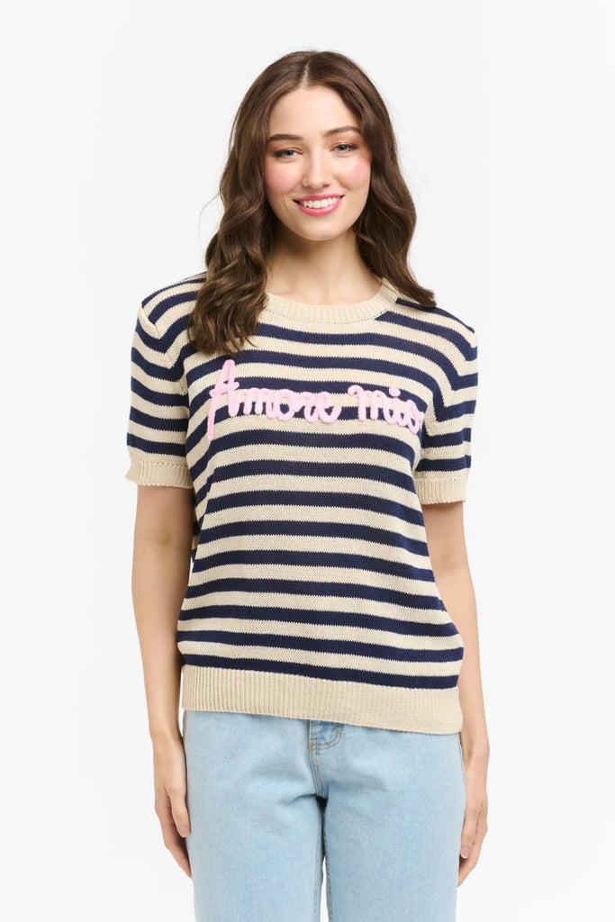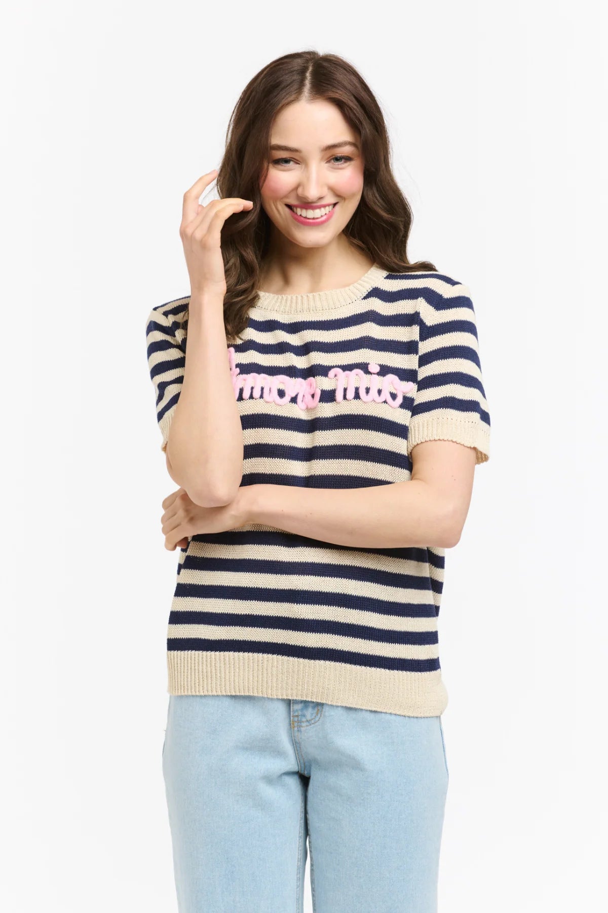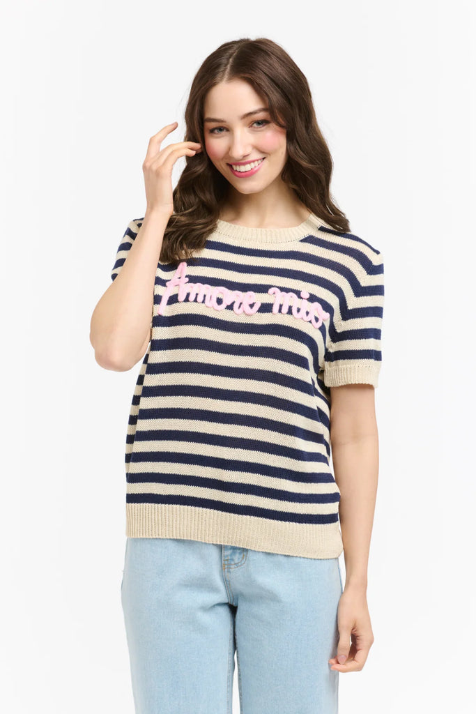 Add a playful, romantic touch to your wardrobe with the Amore Mio Striped Knit Sweater Tee. Crafted from a soft 50/50 cotton-acrylic blend, this lightweight knit features a round neckline, short sleeves, and contrast bands at the neckline, cuffs, and hem for a polished, stylish finish.