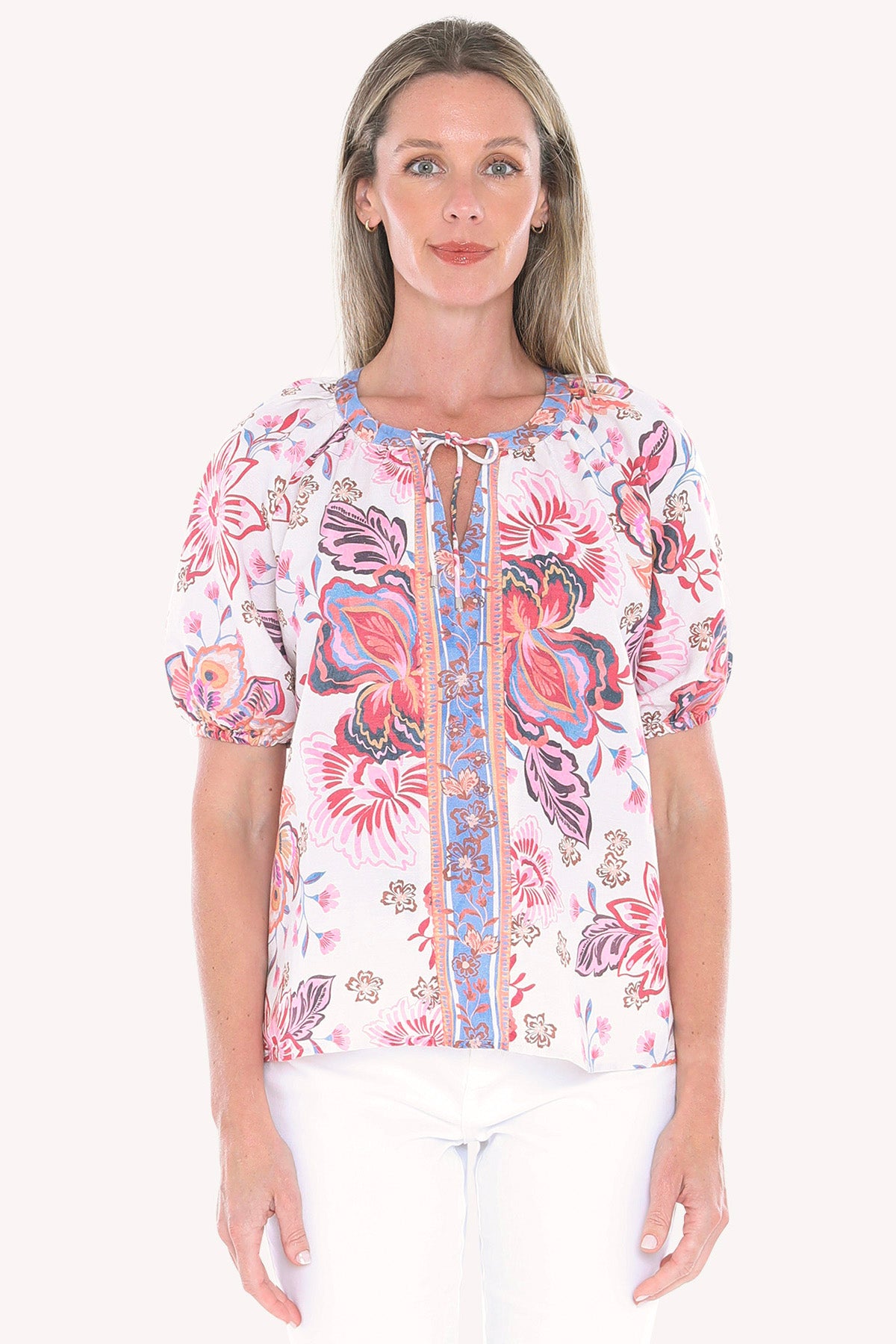 The Sweet Iris Top showcases a striking placement print, adding a bold yet elegant touch to your wardrobe.