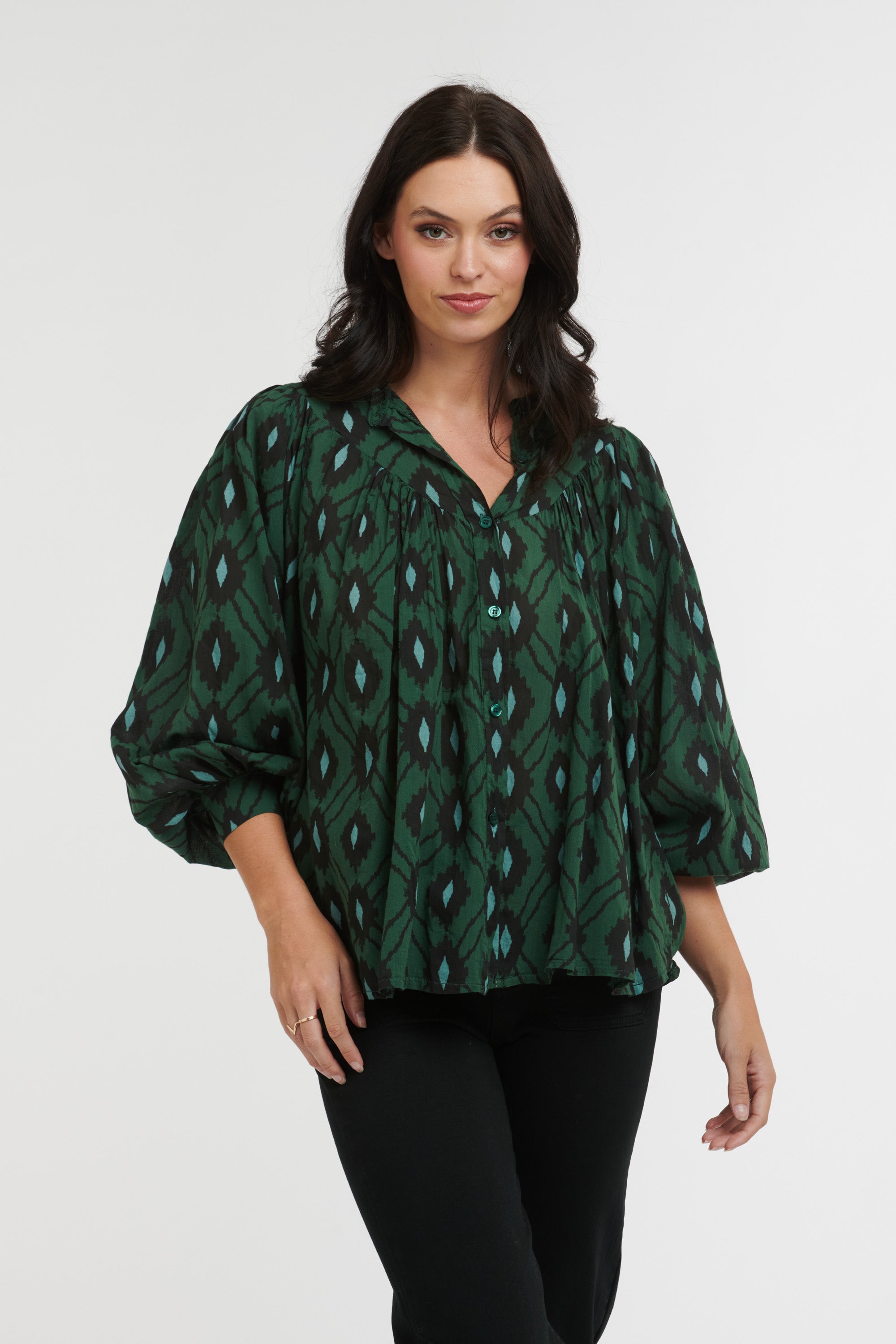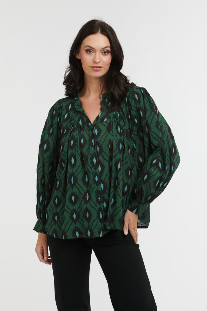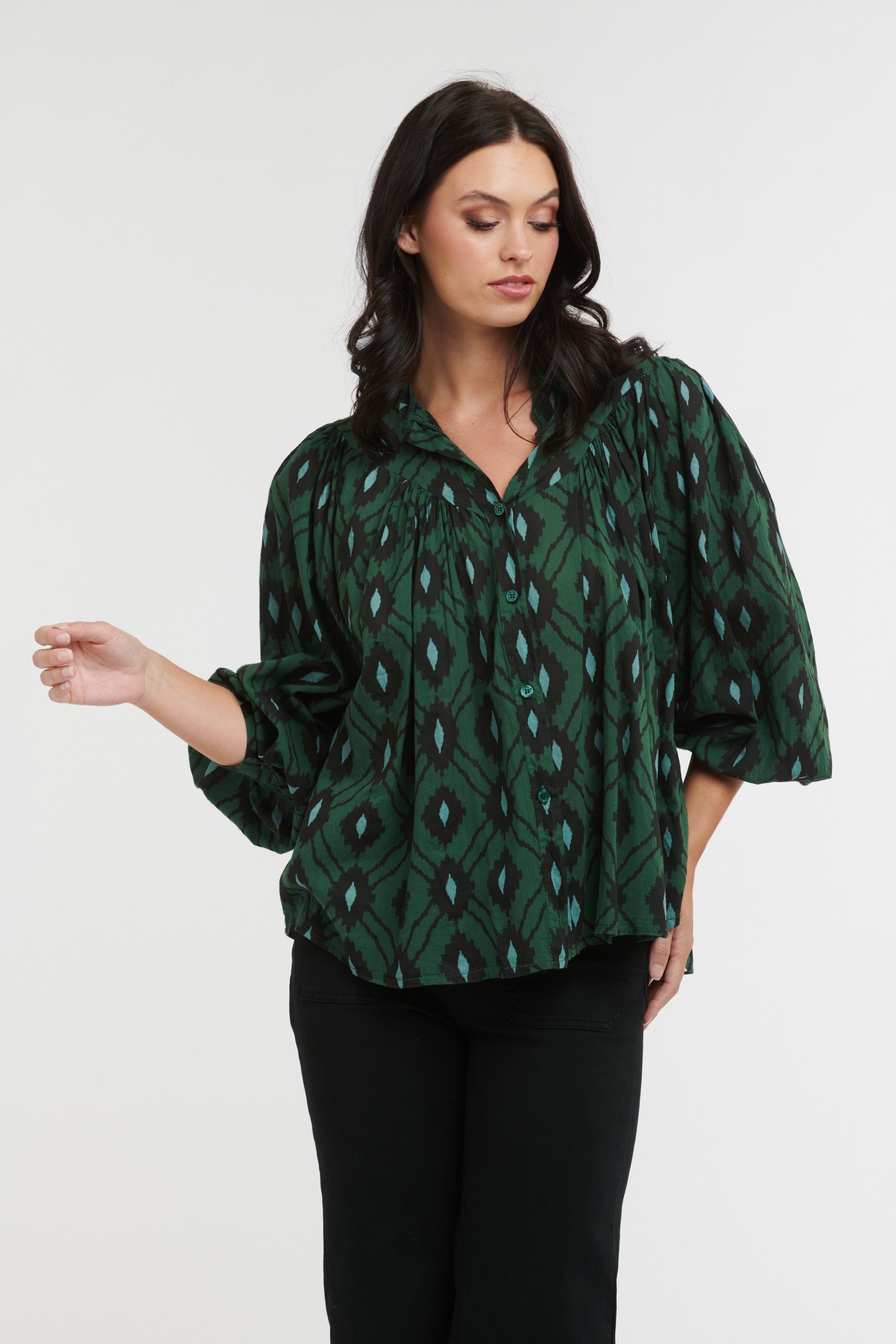 Chic and versatile, the Sybil Shirt - Diamond Print Bottle Green by Italian Star adds a bold statement to your wardrobe. Made from 100% cotton, it showcases a geometric diamond print, complemented by a classic button-front design and adjustable button cuffs. The relaxed silhouette pairs effortlessly with both casual and dressy looks.