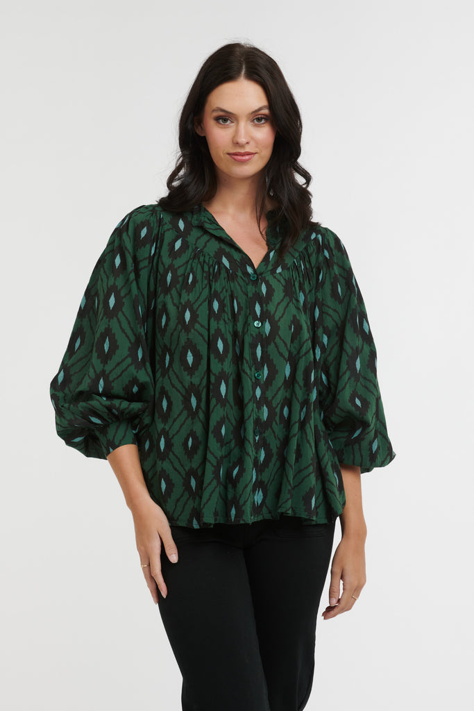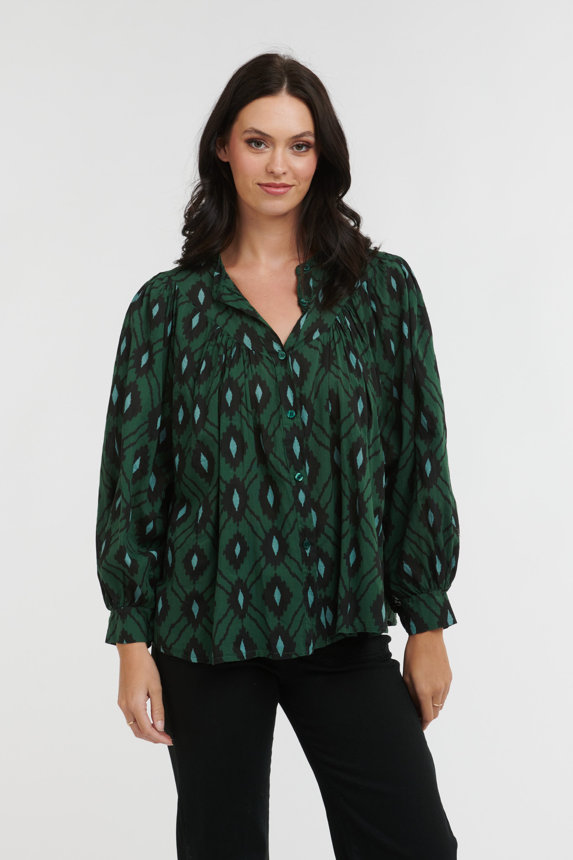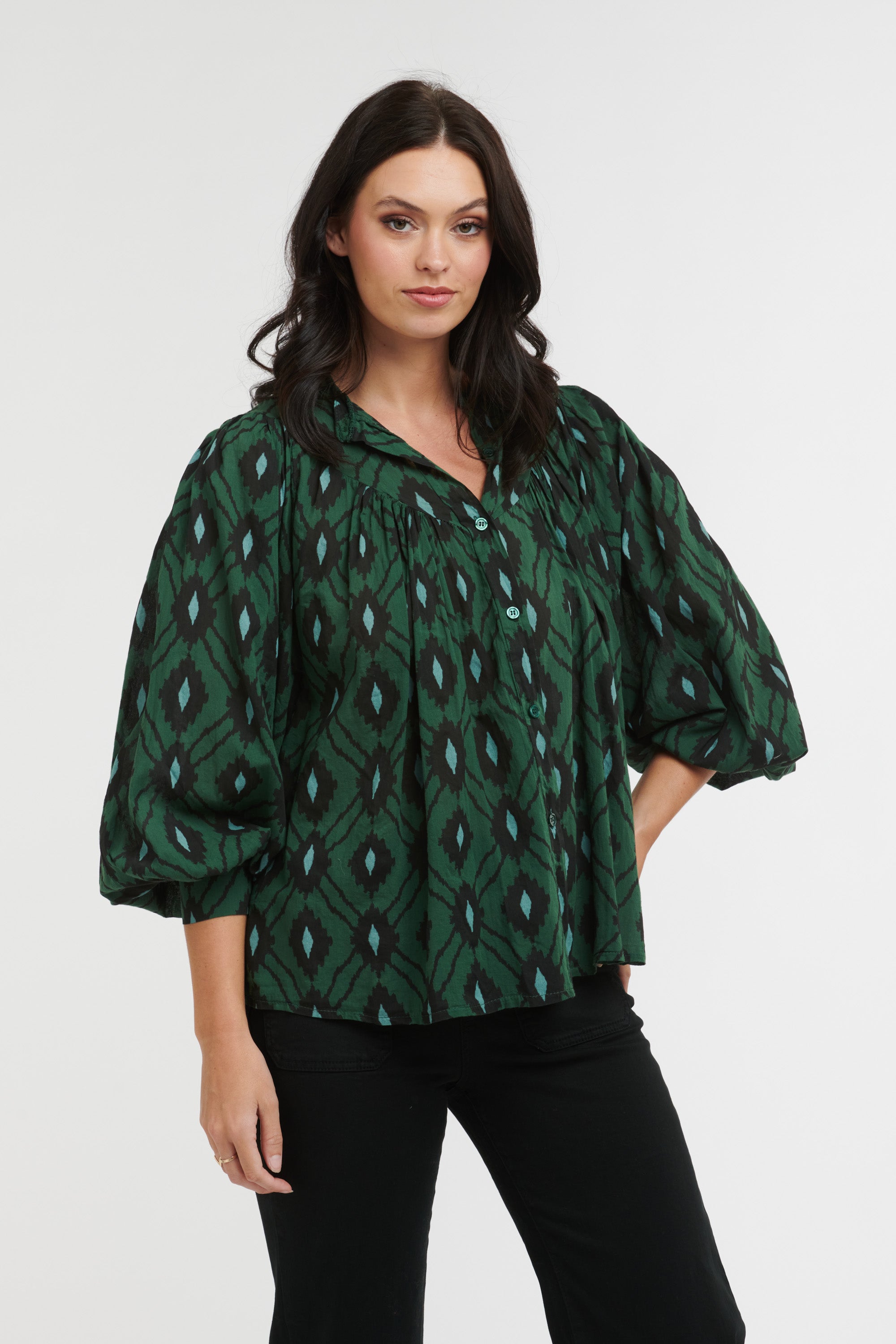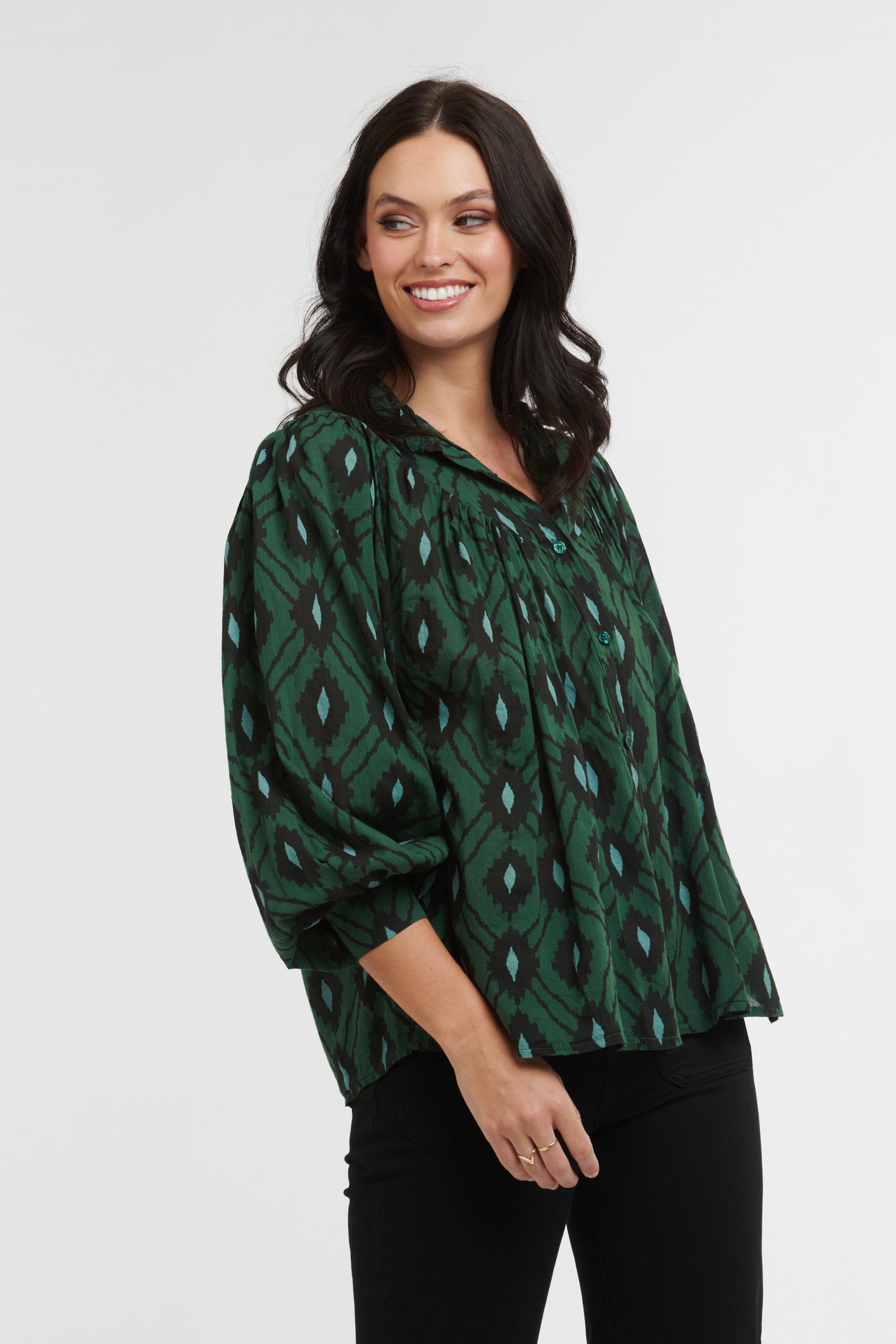 Chic and versatile, the Sybil Shirt - Diamond Print Bottle Green by Italian Star adds a bold statement to your wardrobe. Made from 100% cotton, it showcases a geometric diamond print, complemented by a classic button-front design and adjustable button cuffs. The relaxed silhouette pairs effortlessly with both casual and dressy looks.